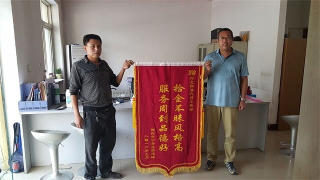 在相关工作失员的联系下,我们立即联系上了失主,并于第二天由宁晋区域的销售人员及时将钱包送回到失主郭建峰手中。面对失而复得的钱包,失主郭建峰十分感激,并于中秋佳节的前一天亲自送来一面锦旗以示感谢。